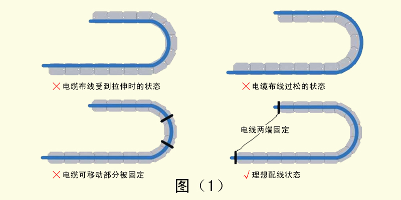 2、如果電纜在布線時(shí)愛(ài)到張力拉伸,會(huì)與拖鏈內(nèi)壁產(chǎn)生摩擦導(dǎo)致護(hù)套磨損。反之如果布線過(guò)于松散,同樣會(huì)與拖鏈的內(nèi)壁產(chǎn)生摩擦造成護(hù)套磨損,并且容易與其他電纜產(chǎn)生纏繞現(xiàn)象。電纜的布線長(zhǎng)度應(yīng)設(shè)定在剛好能通過(guò)拖鏈的中心線宜。電纜的移動(dòng)部分如果被固定,會(huì)導(dǎo)致彎曲應(yīng)力無(wú)法被分散和吸收,會(huì)在固定位置造成應(yīng)力集中。電纜的固定部分應(yīng)設(shè)置在拖鏈的兩端。如圖(1)wpc拖鏈電纜-聚氨酯卷筒電纜-高柔性坦克鏈電纜廠家